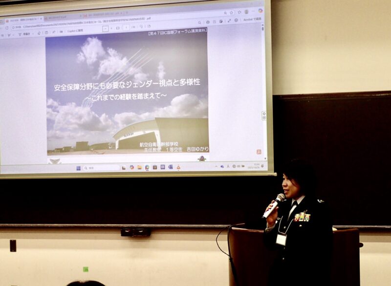 吉田ゆかり航空自衛隊一等空佐から、自衛隊における女性・平和・安全保障といった視点からの体験談を伺いました。吉田さんは防衛大学校女子1期生で、現在航空自衛隊幹部学校教育部主任教官です。