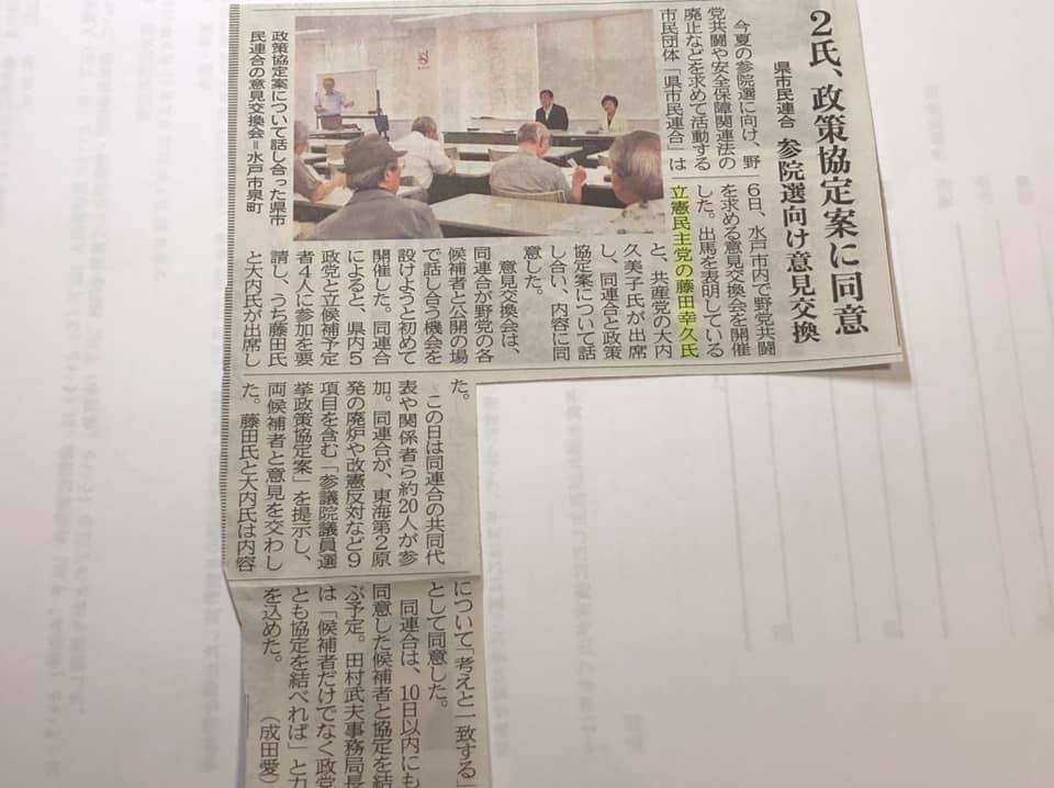 昨日は県市民連合との意見交換会に出席しました。茨城県の参議院議員候補全員を招いたせたそうですが、私と共産党の大内くみ子さんの二人しか出席しませんでした。 市民連合からの政策協定案には大旨賛同出来ると思います。一部動画でご覧下さい。