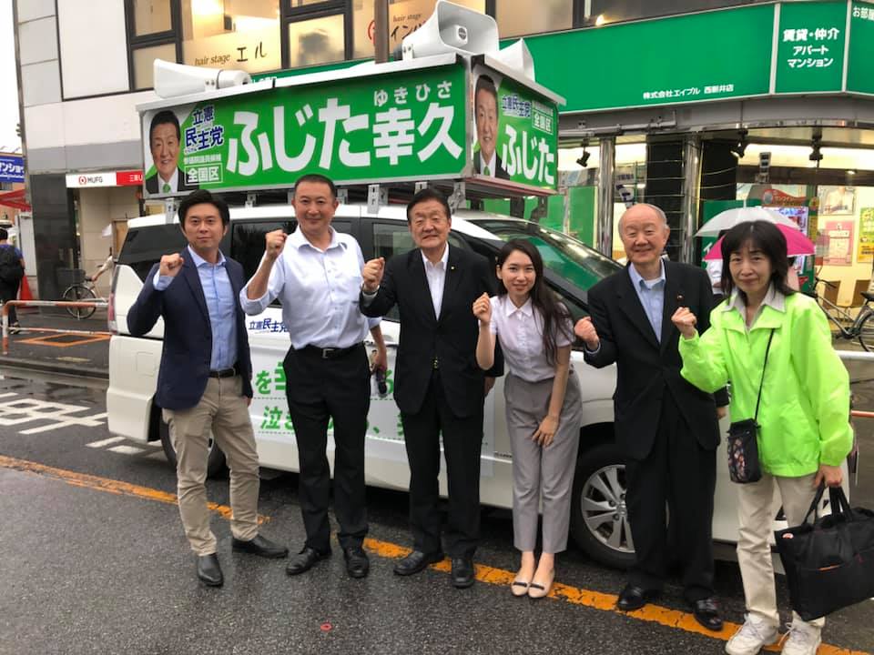 西新井駅西口で夕方の街頭活動を行いました。きたじょう智彦総支部長、銀川ゆい子足立区議、おぐら周平足立区議、鈴木あきら足立区議が勢ぞろいしました! 1枚目クリーム色の用紙には、選挙区の候補者の名前 2枚目白紙の用紙には全国区の『藤田幸久』とお書きください!