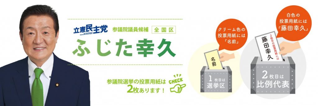 参議院議員通常選挙は、明日が投開票日となります。これまで各地でご支援、激励いただきました皆さんに、厚く御礼申し上げます。SNS、ホームページでの選挙活動の投稿も今日が最後です。まだ投票されていない方は、本日20時までに期日前投票に行っていただくか、明日7月21日当日、是非とも投票所に足を運んで頂き、2枚目の比例代表の投票用紙に「藤田幸久」と書いていただきますようお願い致します!