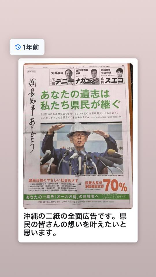 翁長知事の遺志を継いだ玉城知事誕生(1年前)