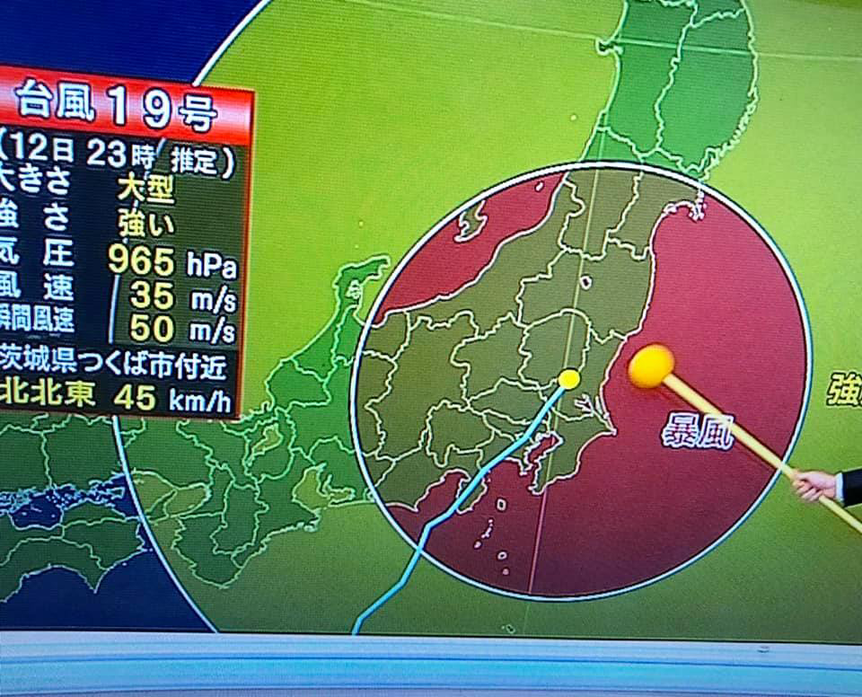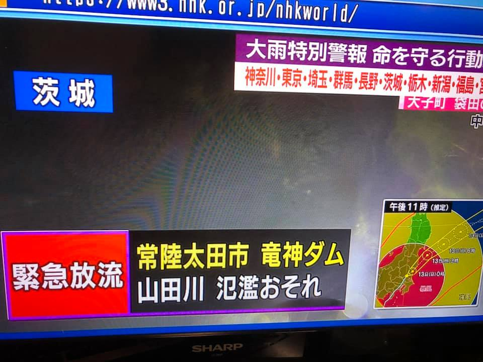 台風19号がつくば市から茨城県北部に向かっています。水沼ダムの放流で大北川が氾濫、竜神ダムの放流で山田川が氾濫、久慈川が増水し大子町に氾濫しました。これから1、2時間が最も激しい暴風雨です。皆さんの安全をお祈りします。県、市町村職員、消防、警察の皆さん有難うございます。ご安全に。(写真はNHKから)