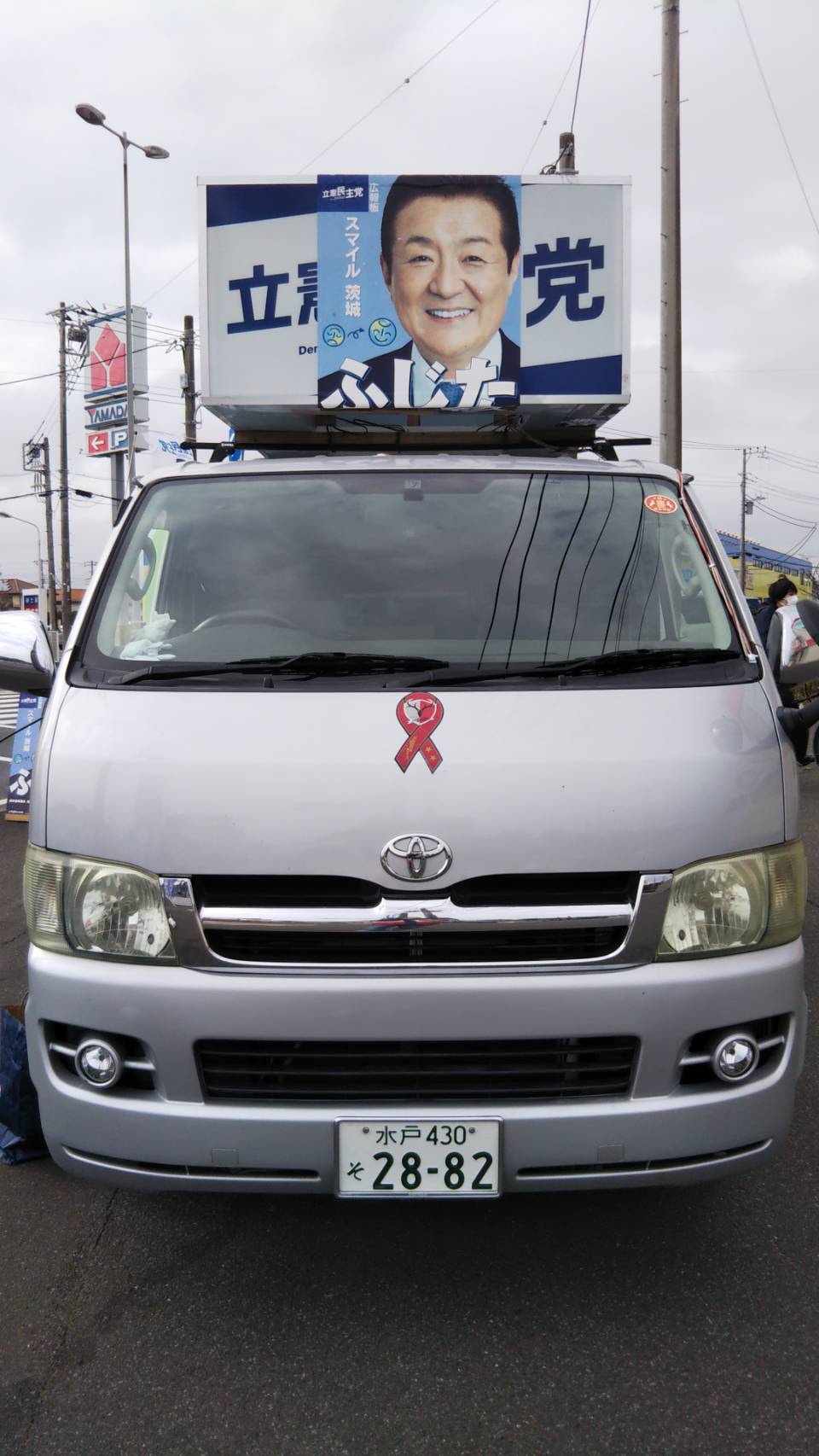 午後は鹿嶋市のチェリオ前の交差点で.菅谷 毅鹿嶋市議会議員と街頭演説を行いました。菅谷さんは最近立憲民主党に入党して、心強い味方です。遊説車の前にはアントラーズのステッカーがそびえています。