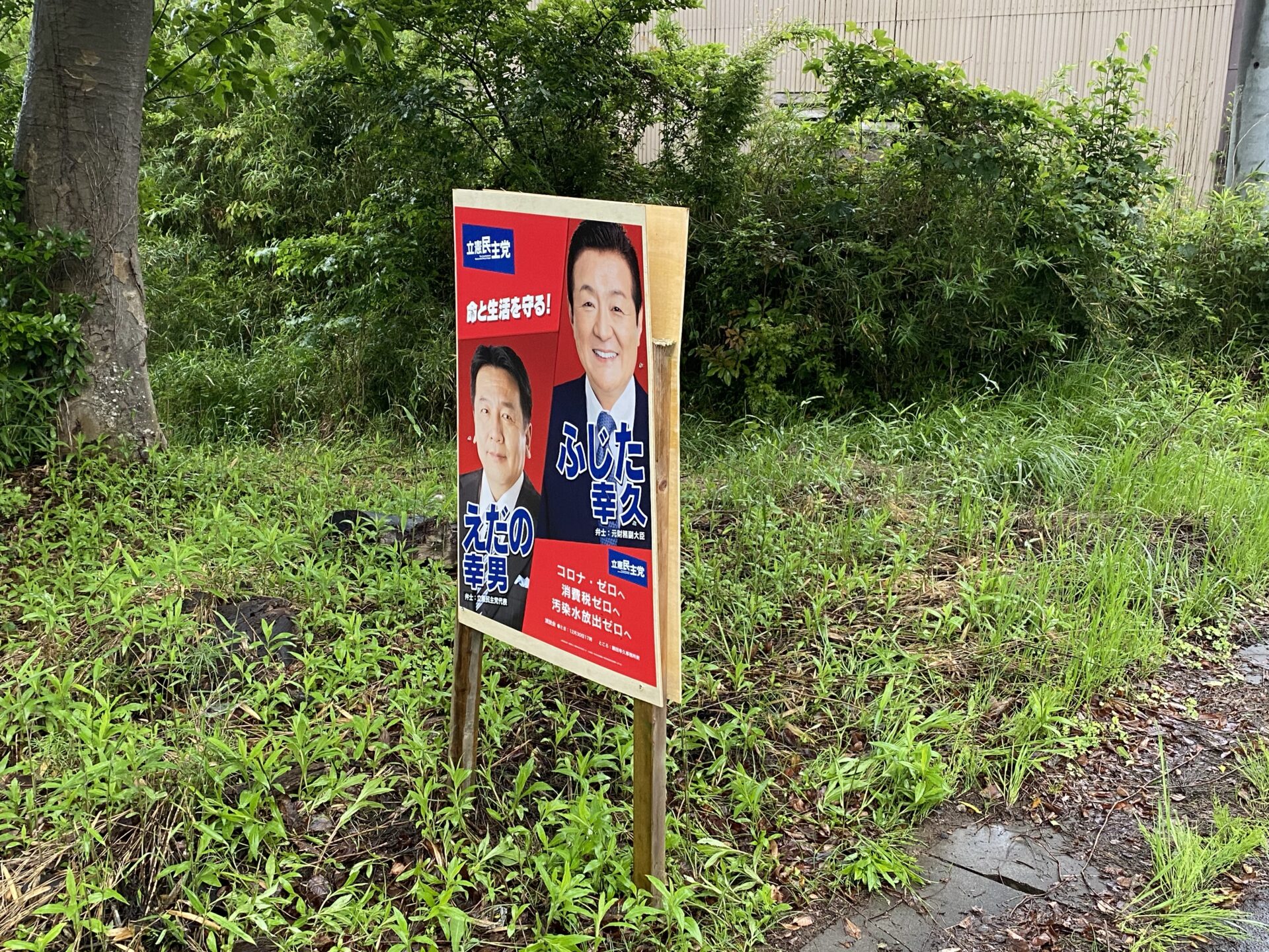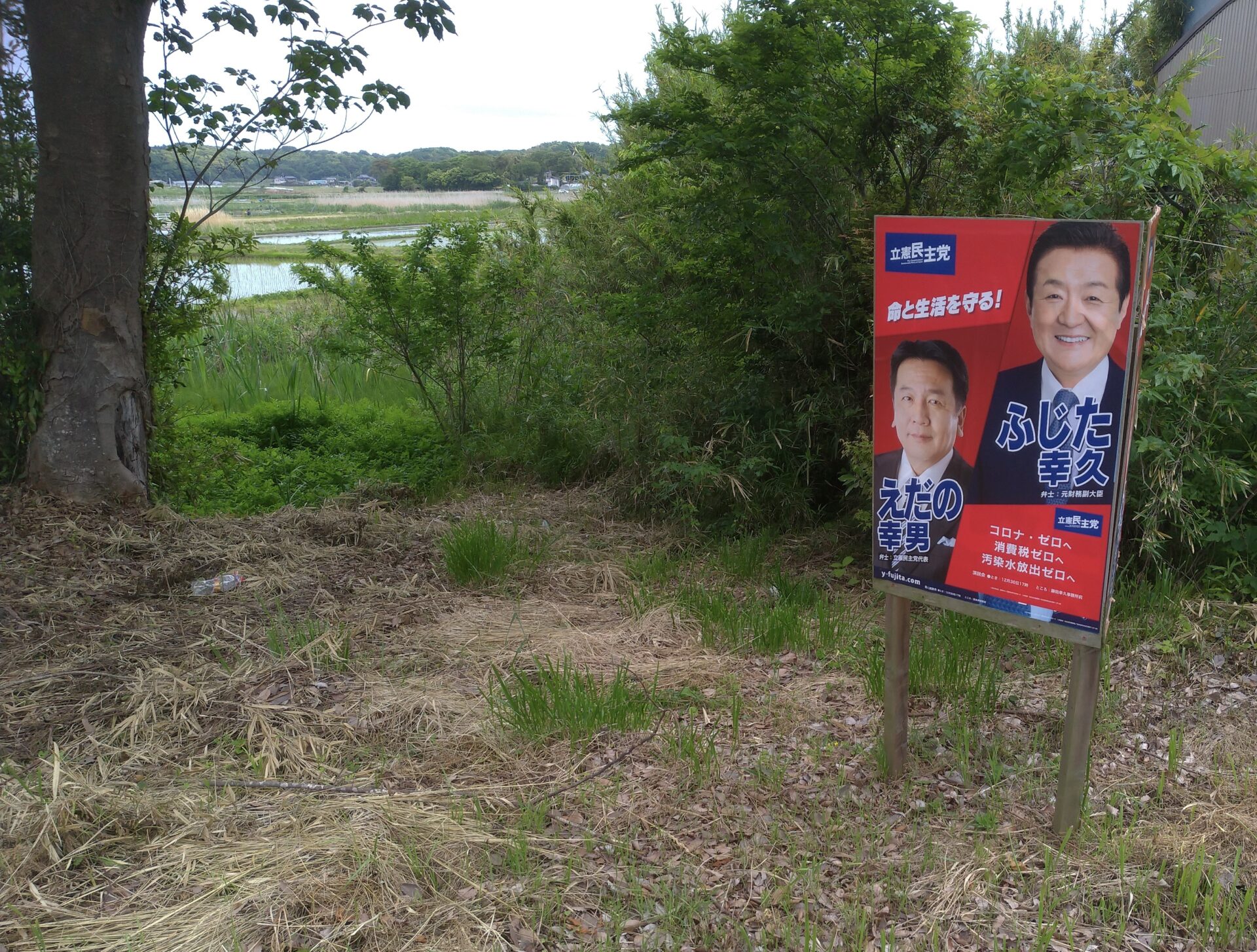 行方市の方から、市道にポスターを立てているのではないか、との問い合わせを頂きました。(写真➀)私は1000枚以上のポスターを、基本的に土地や建物の所有者の了解を頂いて設置して立てていますので、その住所を教えて頂ければ所有者に確認しようと思っていましたところ、市役所から連絡を頂きました。土地所有者の方もそのスポットが市道とは知らずにおられたようで、ポスターを設置してから約1年も経過していました。