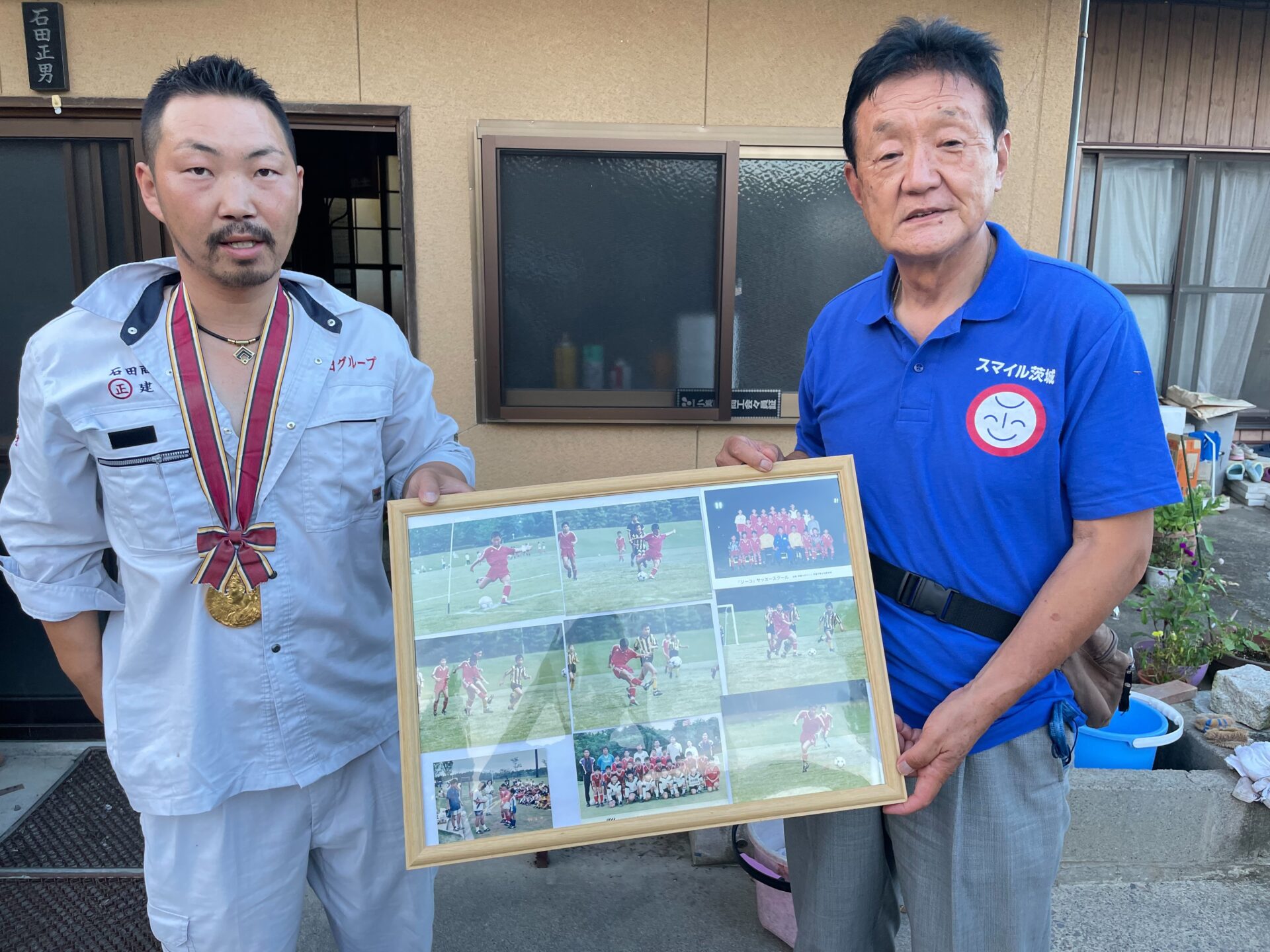 小美玉市でサッカー対決を行いました。石田正光さんは小川小学校時代に茨城県大会で優勝。私は茨城大学附属中学校時代に茨城県大会で準優勝で、小川さんに軍配。加えて小川さんは『ジーコサッカースクール』の元メンバーで、庭にサッカー場まで持っています!完敗でした。