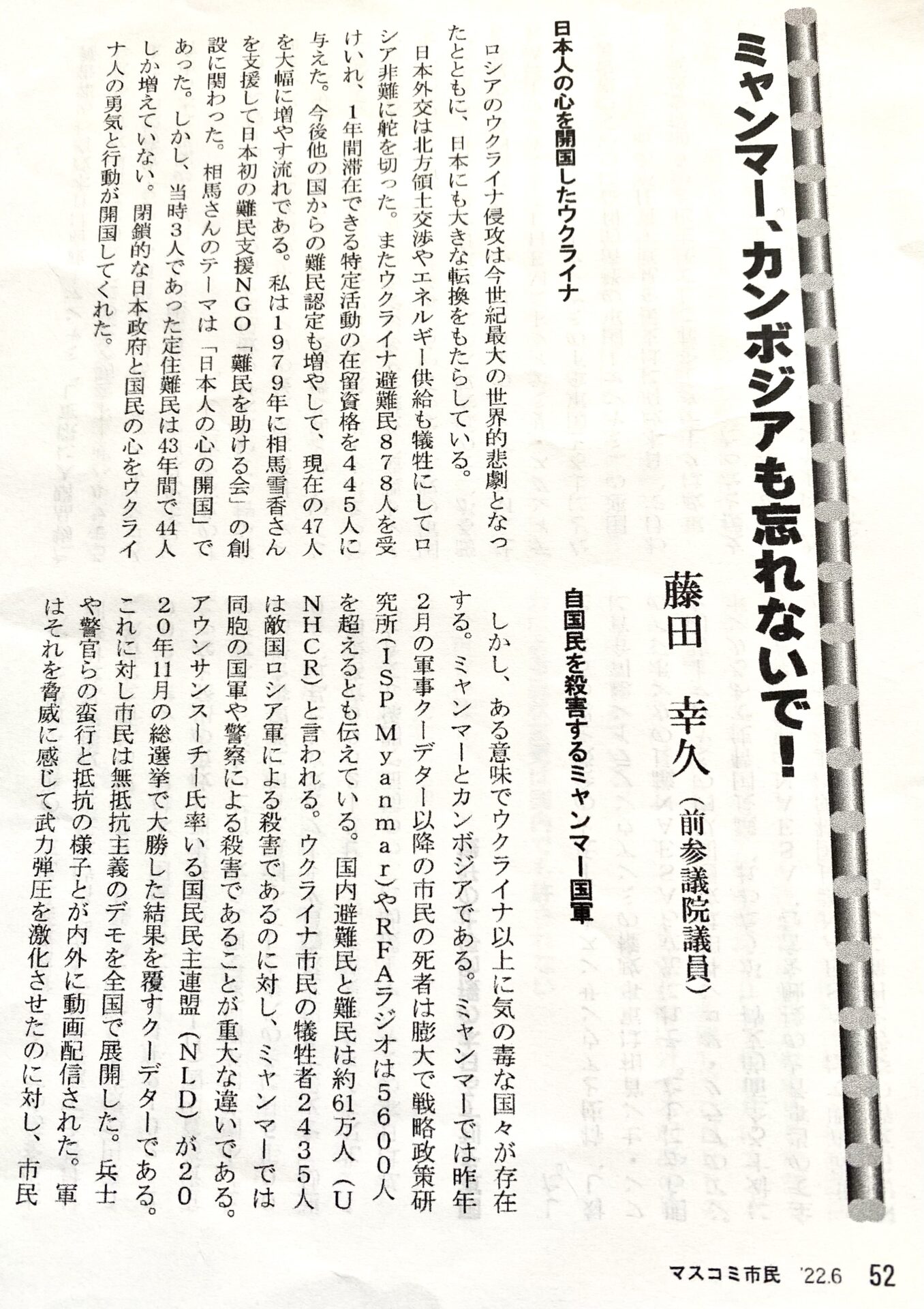 「マスコミ市民」に「ミャンマー、カンボジアも忘れないで!」を寄稿