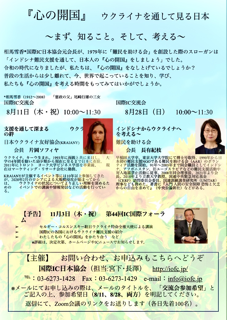 私が会長を務める国際IC日本協会は、「心の開国 ウクライナを通してみる日本」というテーマで連続講演会を開催します。