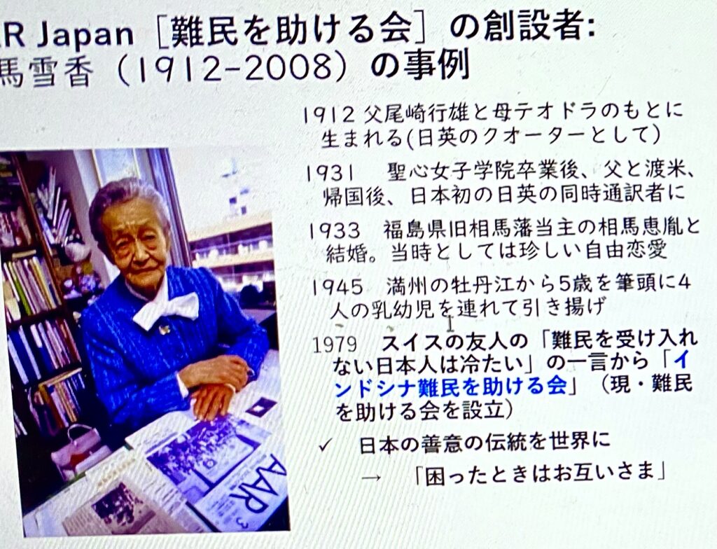 相馬雪香元国際IC日本協会会長(尾崎行雄三女)が「難民を受け入れない日本は冷たい」との一言から1979年に「インドシナ難民を助ける会」(AAR)を創設した経緯から、その後世界65か国までに広げた活動や難民問題の諸課題についてわかりやすく説明頂きました。