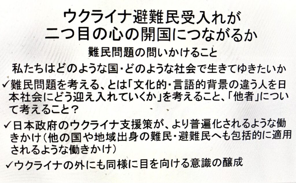 インドシナ難民に対して「心の開国」を果たした日本が、ウクライナ難民支援を通して二つ目の「心の開国」を果たせるかは、ウクライナ以外からの難民、避難民も支援する普遍的な働きかけが必要である、との指摘を頂きました。