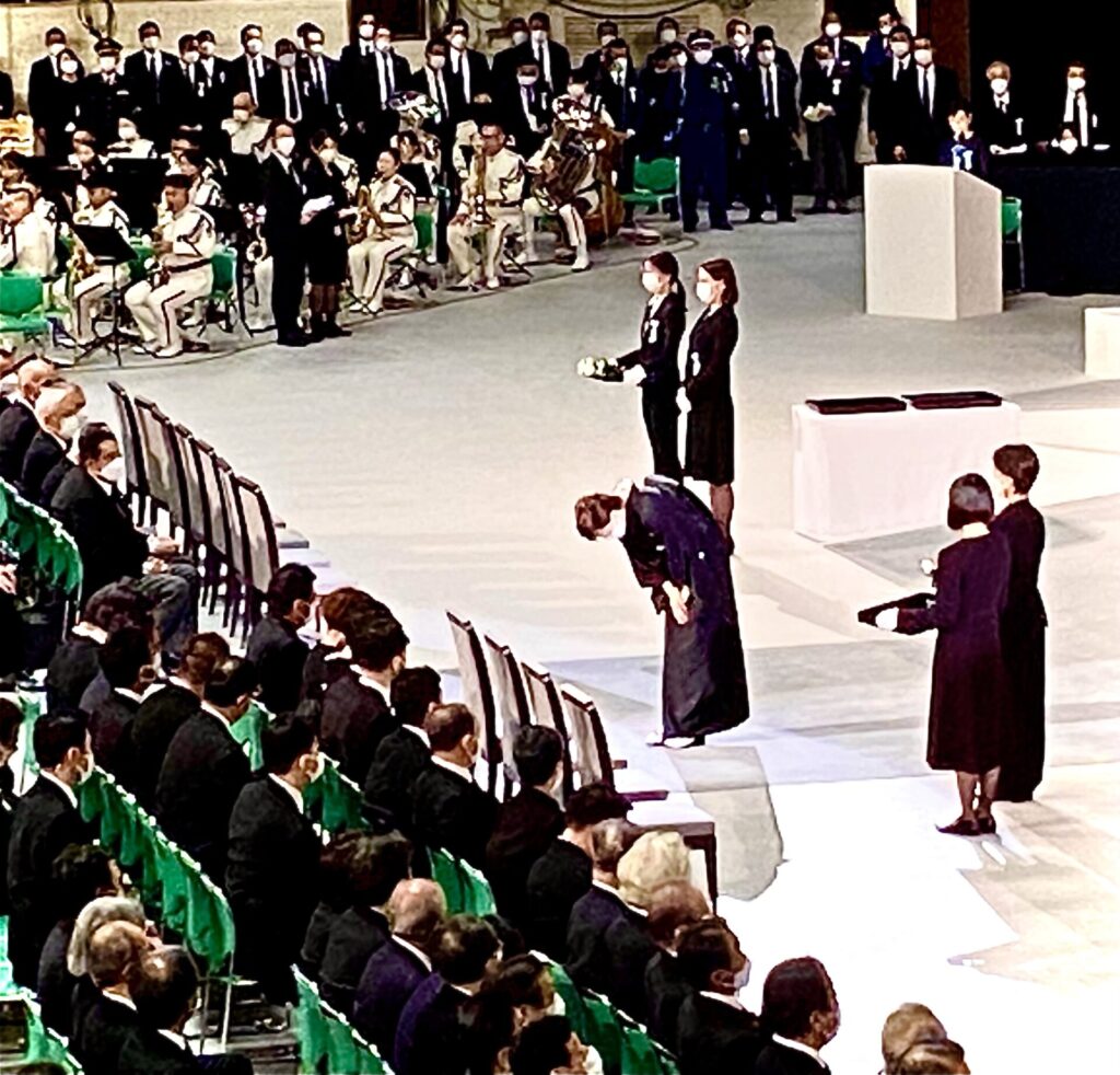 以上は、国葬儀出席を決めた、締め切りの9月13日に親しい方々にお伝えしました。当日日本武道館で感じたことは、安倍昭恵(写真2)夫人の落ち着いた対応ぶりと、菅義偉元首相(写真3)の心に沁みる言葉でした。他方、日本では、様々な細かな段取り、役割分担などが役所の担当部署ごとに脈と継承されており、全体としてなかなか心が伝わりにくい行事になってしまう、と感じました。比較してはいけないことですが、イギリスのエリザベス女王のご逝去から国葬に至る流れも思い起こしました。