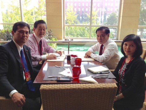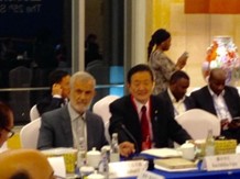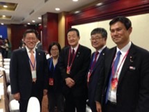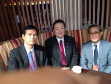 アジア政党会議出席の各国代表と交流しました。写真の順番に、韓国議員団、ベトナム共産党トラン・ダク・ロイ対外関係副委員長、イランのハッサン・ガフォーリ・ファルド元副大統領、カンボジアのケオ・プット・ラズメイ国王枢密院委員です。