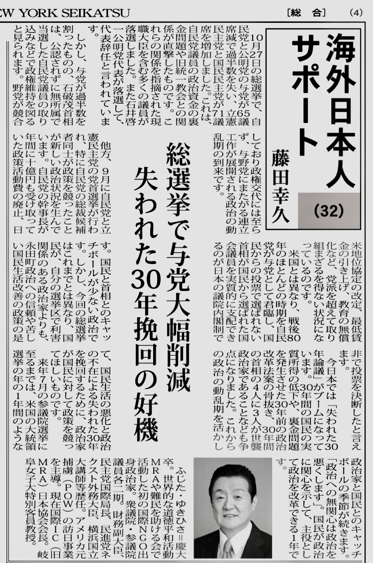 週刊NY生活32 「総選挙で自公大幅削減 失われた30年挽回の好機」