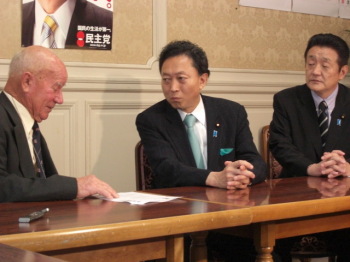 19日は、今回の訪日の支援をしてくれた、福島みずほ社民党党首、国民新党自見正三郎副代表、新党大地鈴木宗男代表などを表敬しました。そして国会の合い間を縫って鳩山由紀夫民主党代表も時間を取って下さいました。鳩山さんからは、弟の邦夫代議士のエミリー夫人のお父さんがオーストラリア人で親しみを感じると述べたのに対し、クームズさん達からは、次の総選挙で是非民主党が政権を取って、捕虜政策などに取り組んで欲しいとの期待が表明されました。鳩山さんは、個人として、クームズさんとマクアルティさんのお父さんが、捕虜としての苦しい体験をされたことに対してお詫びされ、それに対する補償がなされるべきだと思うとの気持ちを表明されました。