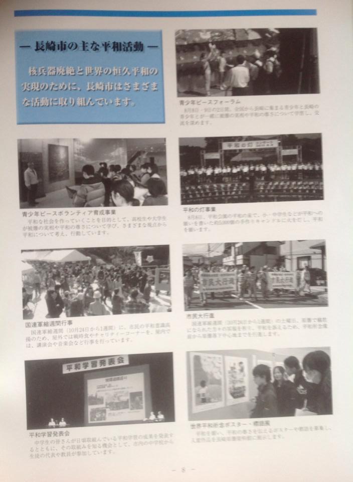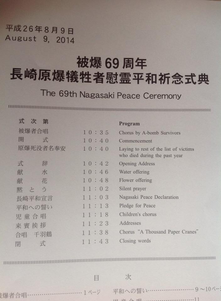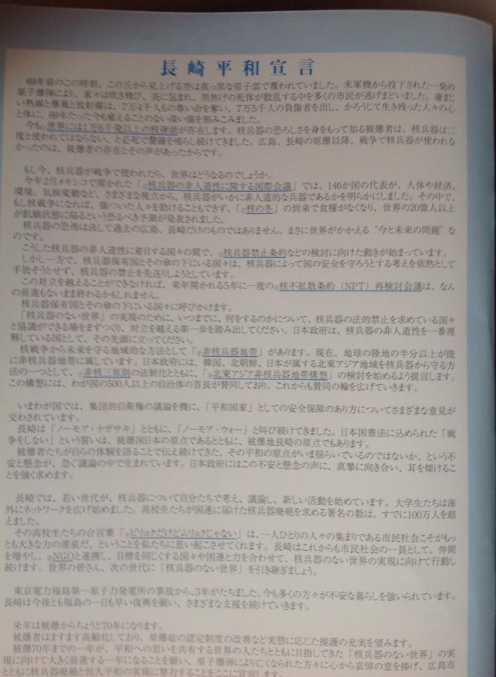 8月9日の平和祈念式典の資料 Published: 2014-08-16 長崎市から、8月9日の平和祈念式典の資料が届きました。式次第や平和宣言などの英文もしっかり入っています。平和宣言の主なキーワードに下線が引かれ、その解説が載っています。平和活動や、被爆建築物も書かれています。素晴らしい広報活動と配慮に感動しました。政府も、政党も、議員もこうした発信が必要だと、自分の反省も含めて思わせて頂きました。