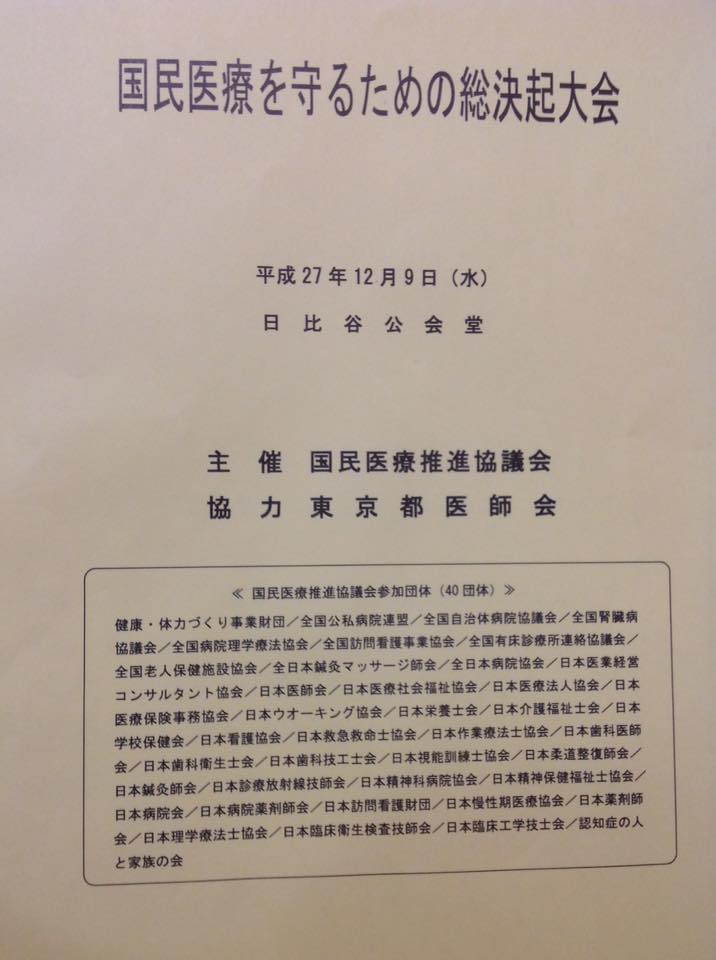 国民医療を守るための国民集会に出席しました Published: 2015-12-11 国民医療を守るための国民集会に出席しました。日比谷公会堂に日本医師会、日本歯科医師会、日本看護協会を初めとする多くの医療団体が集まり、医療崩壊を防ぐために診療報酬アップを訴えました。この15年程の間で診療報酬アップを実現したのは民主党政権時の二回だけです。