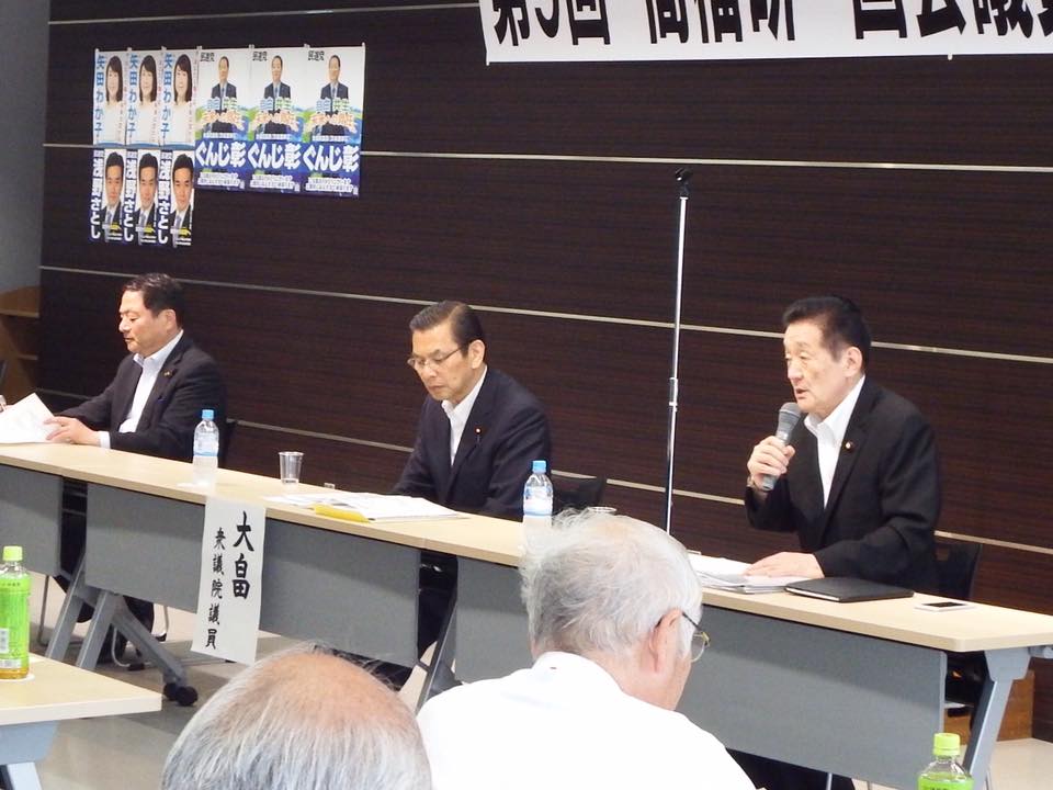 高齢者福祉政策研究会で講演しました Published: 2016-06-11 高齢者福祉政策研究会で大畠章宏衆議院議員、郡司彰参議院議員と共に講演しました。そして郡司彰、浅野哲候補の激励を行いました!