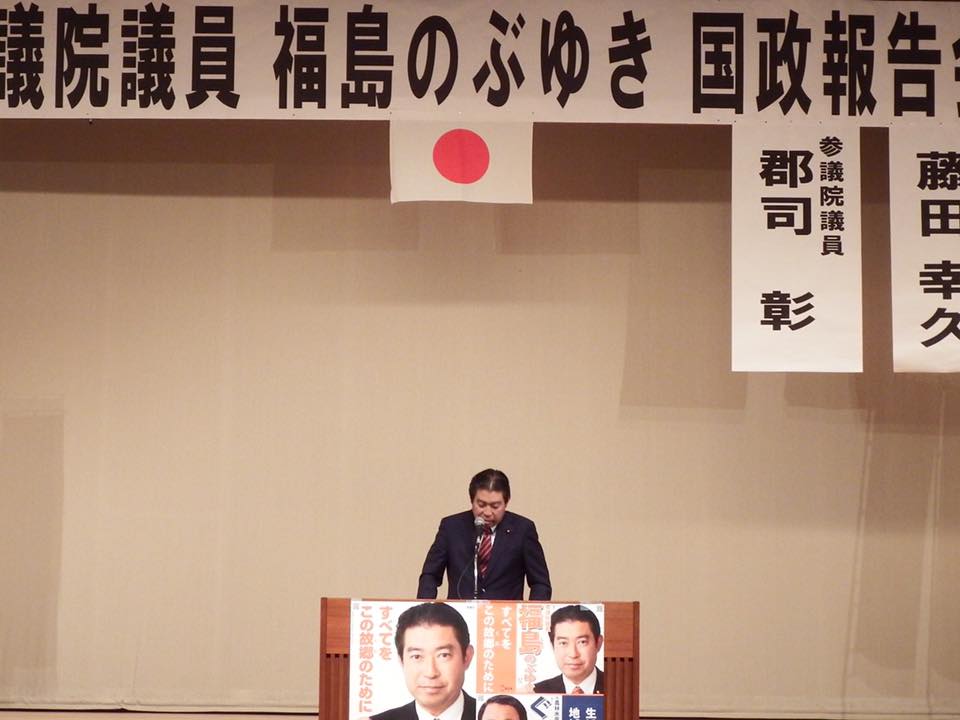 水戸市で開かれた福島伸享衆議院議員の国政報告会に出席しました Published: 2016-06-11 水戸市で開かれた福島伸享衆議院議員の国政報告会に出席しました。予算委員会で5回安倍首相を追及した活躍が報告されました。