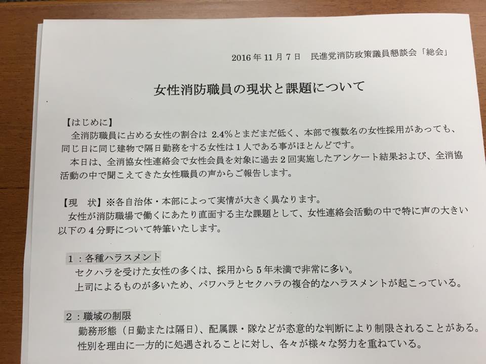 消防政策議員懇談会に出席しました。女性職員が増えて喜ばしい一方、ハラスメント対策が重要です。
