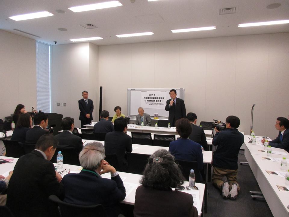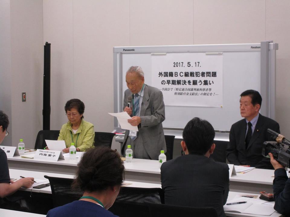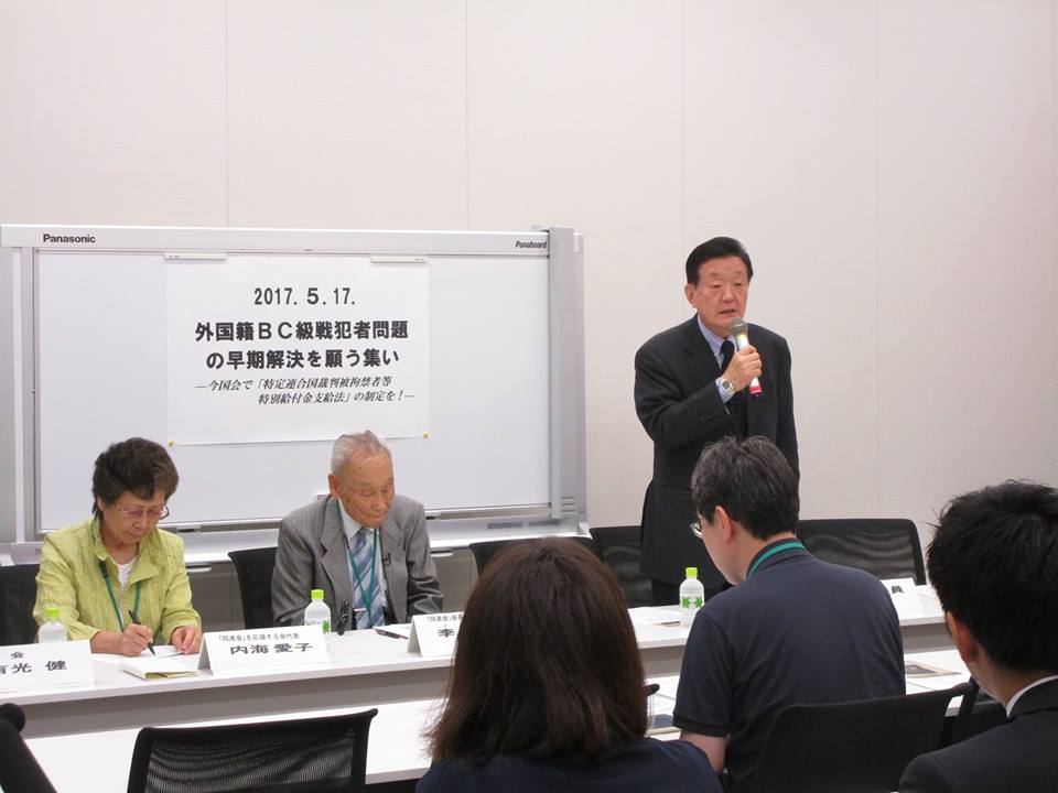 外国籍元BC級戦犯者問題の早期立法解決を願う集いに参加しました Published: 2017-05-17 外国籍元BC級戦犯者問題の早期立法解決を願う集いに参加し、今通常国会での「特定連合国裁判被拘束禁者等特別給付金支給法」制定を呼びかけました。韓国人元BC級戦犯者・同進会会長の李鶴来さんも92歳になられ、生存する対象者はわずか3名になっています。 日韓議員連盟で進めている支援法案の一日も早い制定を訴えました。