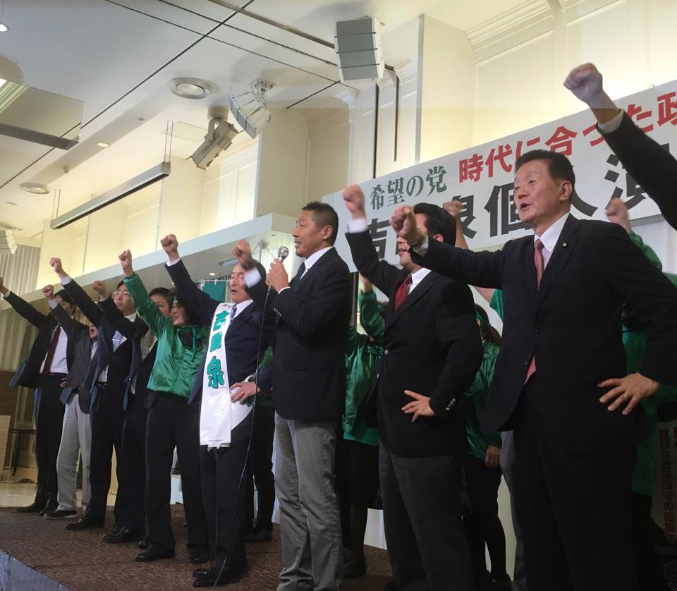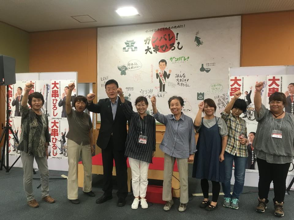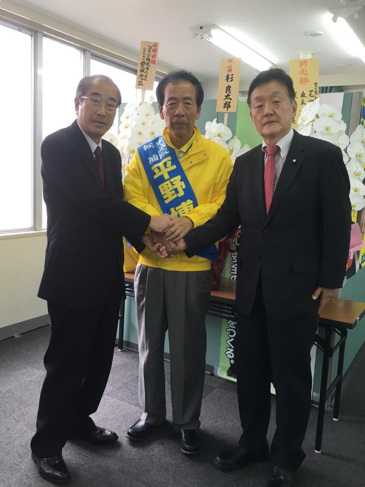 大阪の平野博文元官房長官の応援に駆けつけました。無所属の出馬です。高島屋良充元参議院幹事長が選対本部長です。