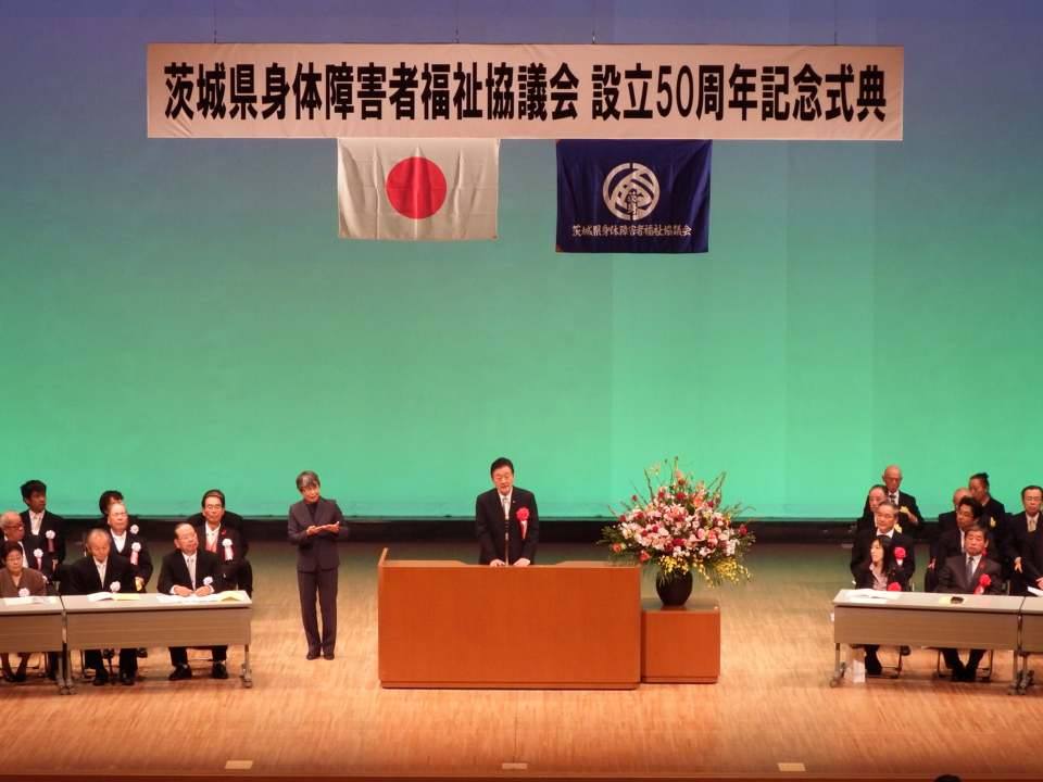 茨城県身体障害者福祉協議会50周年記念大会に出席しました Published: 2017-11-09 茨城県身体障害者福祉協議会50周年記念大会に出席しました。長年身障者の支援活動を行った方々、自力更生をされた方々が表彰を受けました。私は日本の身障者が寄付して下さった車椅子をカンボジア難民キャンプの身障者難民にお届けした際の体験をお話しました。