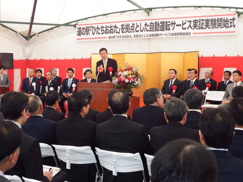 道の駅「ひたちおおた」を拠点とした自動運転サービス実証実験開始式に出席しました Published: 2017-11-18 道の駅「ひたちおおた」を拠点とした自動運転サービス実証実験開始式に出席しました。 13箇所で実証実験をするうちの1箇所が「ひたちおおた」です。地域への効果を期待します。