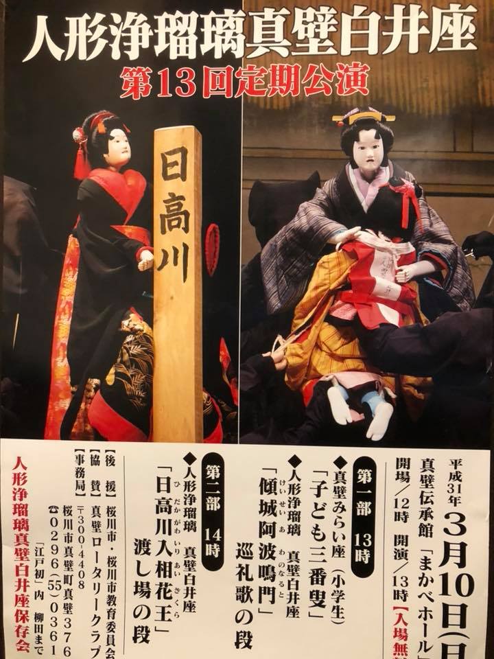 人形浄瑠璃真壁白井座第13回定期公演に行って参りました。 Published: 2019-03-10 人形浄瑠璃真壁白井座の公演を観賞しました。白井座の会長で浄瑠璃を務めた青木秀史さんは、私の同級生。団員不足と高齢化が悩みの種とのこと。皆さん、支援をお願いします!