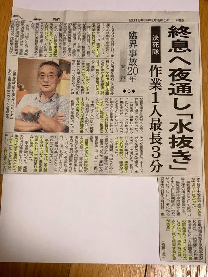 茨城新聞に、20年前の東海村のJCO臨界事故で、「水抜き」の決死隊を指揮した田中俊一氏(原子力規制委員会初代委員長)のインタビューが掲載されています。違法作業が続いた結果の臨界事故は「たまたま起きたのではなく、『起こした』ものだ」と語っています。別の決死隊指揮者の一人は「事故時には、多くの知見を結集する必要がある」とも述べています。 しかし、東日本大震災の福島第一原発事故の後、田中俊一さんなどのJCO事故早期終息の知見を政府は活用しようとしませんでした。そこで、ある茨城県の幹部からの提案で、私が田中さん達を海江田経産大臣と細野首相補佐官に紹介しました。ところが、経産省の役人達は、文科省系の日本原子力開発機構の田中さん達の関わりに抵抗して手こずる場面も生じました。 その後、私は福島県の飯館村や伊達市で田中さん達がボランティアで行っていた除染活動を政府に紹介することにもなりました。因みに、田中さんは初代の原子力規制委員会委員長に就任しましたが、私はその人事には全く関わっていません。(2年前にある月刊誌が、私がこの人選に関わったという記事を掲載しましたが、全くの事実無根です。) 福島第一原発事故でも、現場で獅子奮迅の活躍をした故・吉田所長や、多くの現場の決死隊の活躍があります。現場の英雄達の活躍には心から感謝する一方で、それらの方々に報いるためにも、田中さんが述べているように、「原子力安全行政」のあり方、そして原子力発電のあり方そのものを問い直す時です。