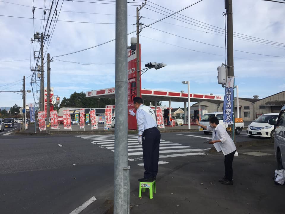 6日の朝の街頭活動は小美玉市部室の交差点。多くのボランティアの皆さんに応援頂きました。