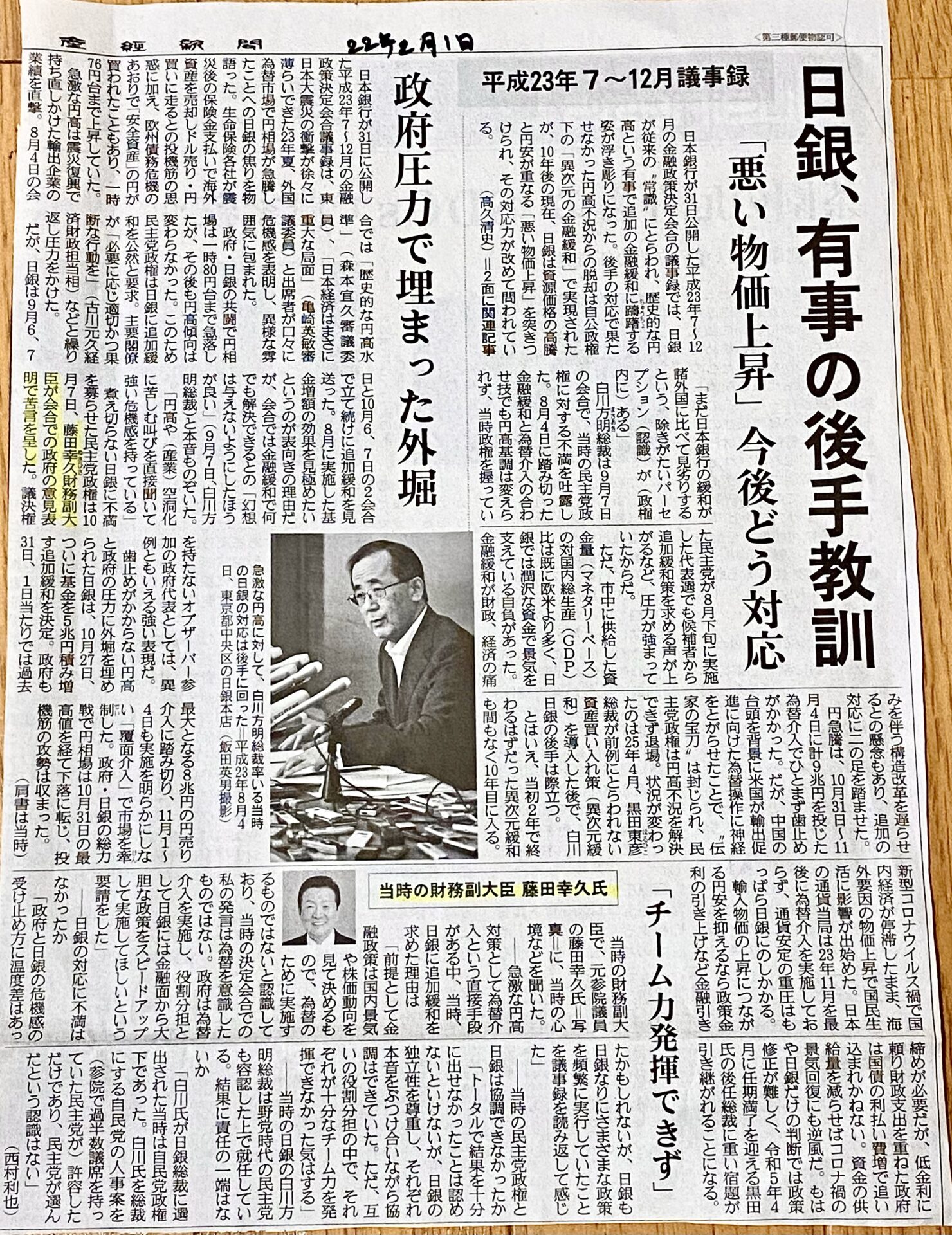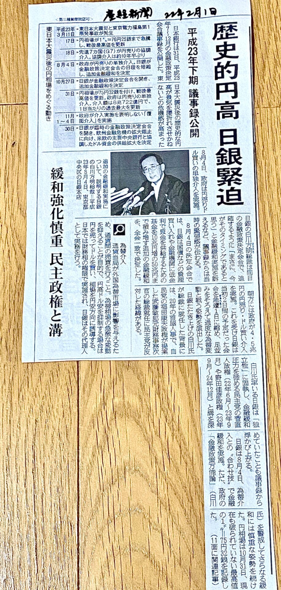 昨日のネット配信に続き、今朝の産経新聞が10年前の日本銀行政策決定会合について報道し、私のインタビューも掲載されました。歴史的円高を日銀が止められなかった、といった見出しで、現在の黒田総裁の日銀を肯定するかのような組み立てですが、状況は今の方が深刻と思われます。