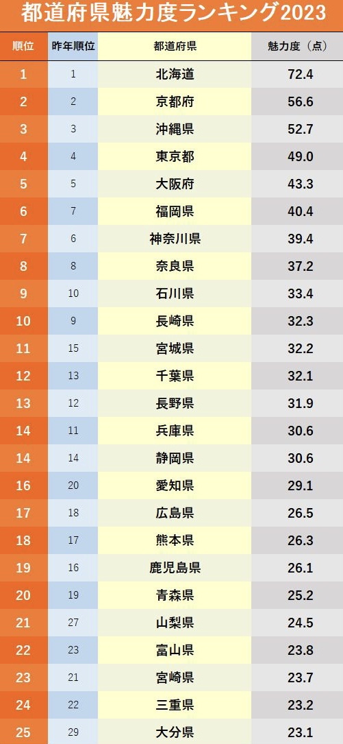 『都道府県魅力度ランキング』が14日に発表されました。ブランド総合研究所による調査です。北海道が15年連続で1位。2位も15年連続で京都。3位沖縄、4位東京、5位大阪と昨年と同じです。最下位は昨年46位の茨城で、佐賀と入れ替わりました。45位が埼玉、44位が群馬、42位は同率で山口と徳島です。