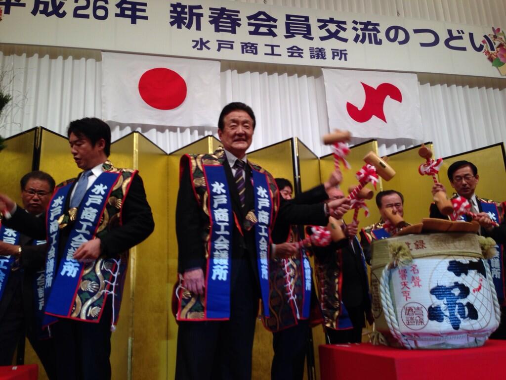 水戸商工会議所新年会に出ました。水戸黄門の陣羽織を着ての鏡割