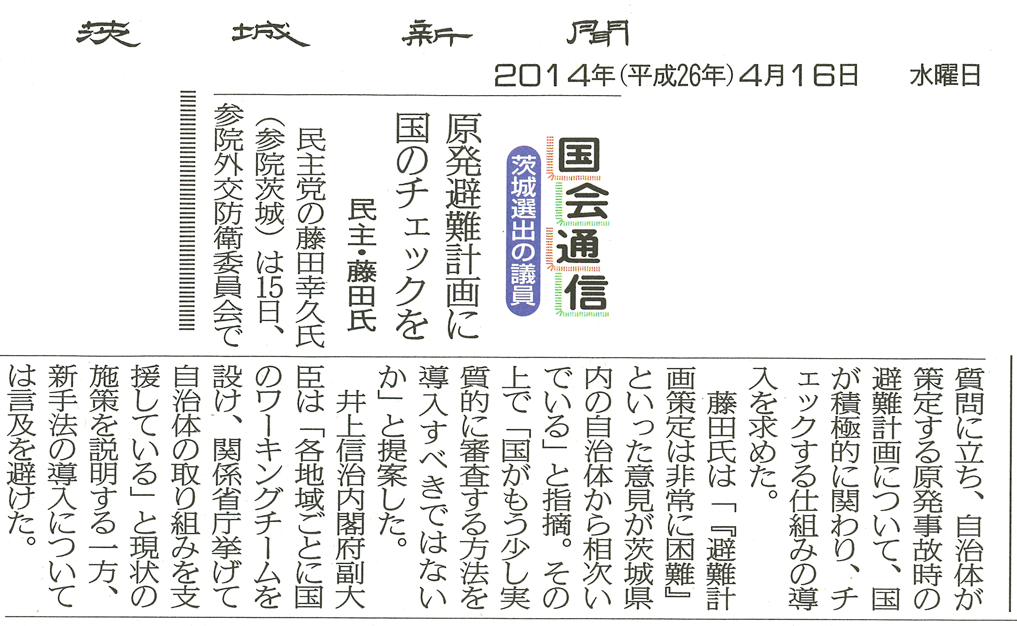 この質問について、茨城新聞4月16日版「国会通信 茨城選出の議員」でレポートされました。